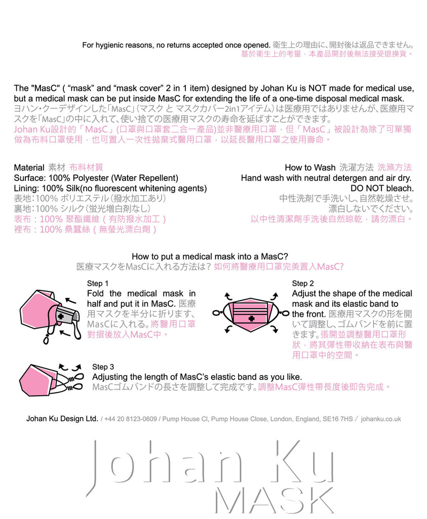 Johan Ku設計的「MasC」(口罩與口罩套二合一產品)並非醫療用口罩,但「MasC」被設計為除了可單獨做為布料口罩使用,也可置入一次性拋棄式醫用口罩,以延長醫用口罩之使用壽命。 - For hygienic reasons, no returns accepted once opened.